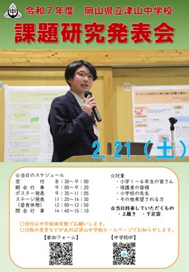 当日は中学校3年生が1年間かけて行ってきた研究テーマについてポスター発表やステージ発表を行います。事前の申し込みは以下のURLからお願いします。