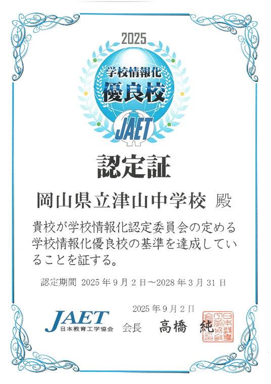 この度、本校が日本教育工学協会より学校情報化優良校に認定されました。本校は前期も認定されていたため、2期続けての認定ということになります。今後もICT機器を積極的に活用しながら本校の教育活動を進めていきたいと思います。