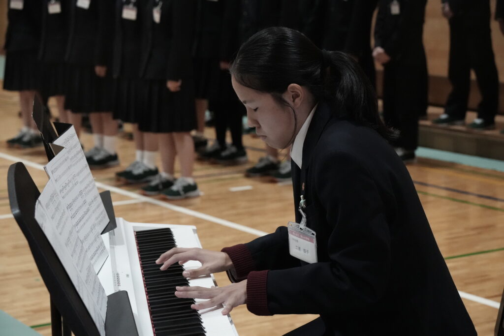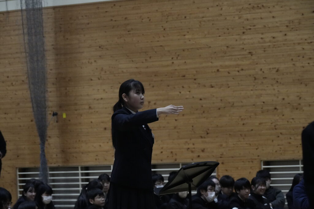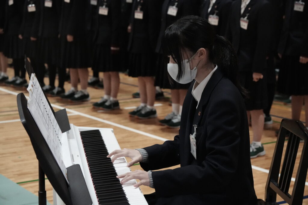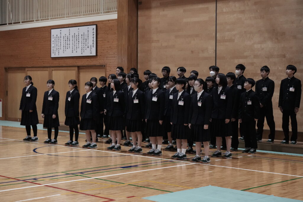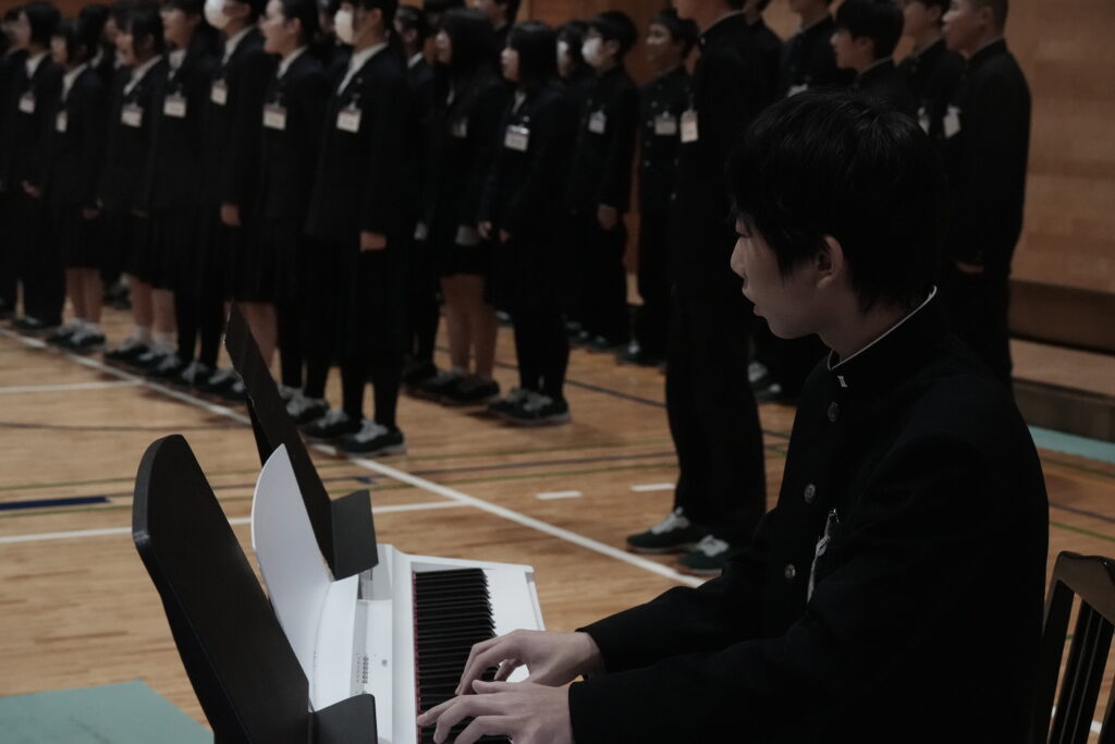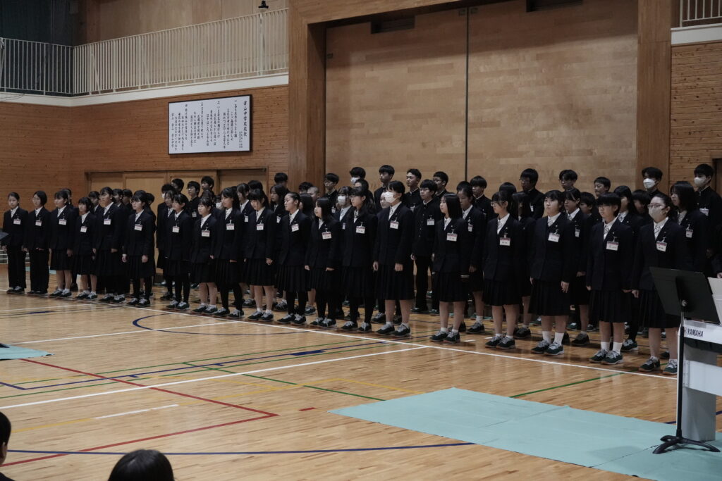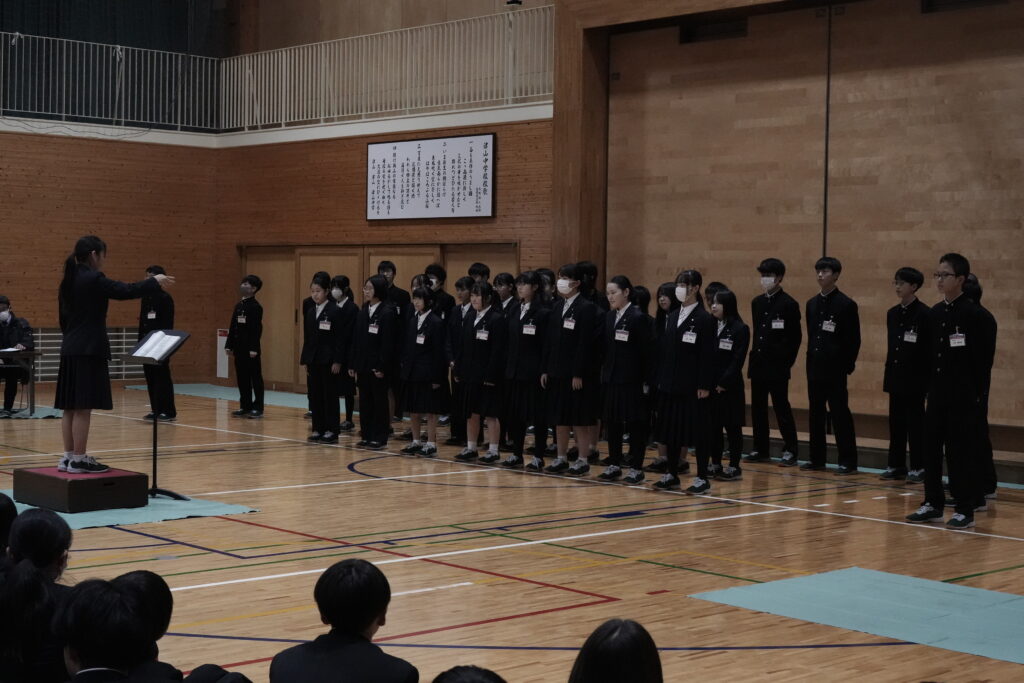 2年生はA組が「ハートのアンテナ」、B組が「地球星歌 ~笑顔のために~ 」、学年全体で「心の瞳」を歌唱しました。昨年の経験を活かし、体育館全体に響き渡るような大きな声で歌っていました!いずれも難しい曲で、練習は困難でしたが、クラス・学年で協力して取り組むことができました。