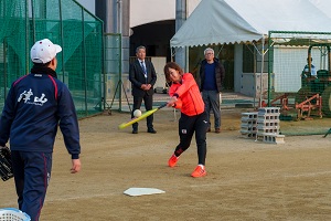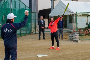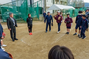 放課後には、野球部を中心に原田さんにキャッチボールやバッティング指導をしていただきました。生徒たちは原田さんの投げるボールの強さに驚いたようでした。また、グローブもいただき、非常に喜んでいました。原田さんに教えていただいたことを胸に、今後も精進してほしいと想います。