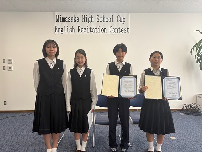 10月18日(土)に美作高等学校で行われた「第1回 美作高校杯 英語暗唱大会」に本校生徒4名(ハイグレード部門)が参加しました。1年生の森安さんが2位を、3年生の美納さんが3位を受賞しました。今回の大会では、全員が同じ物語の文章を練習し、発表しました。同じ原稿でも声の大きさや表情、イントネーションのつけ方で、それぞれの個性がしっかりと表れていてとても印象的な大会でした!