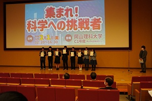 2月1日(日)に岡山理科大学で「集まれ!科学への挑戦者」が開催され、本校から4名が参加しました。審査員である大学の先生方を前に、堂々と自分の研究を伝える姿は非常に立派でした。「Be a challenger」の精神で、外部での発表に挑戦した4名に大きな拍手を送りたいと思います。そして、54組中上位8組に与えられる優秀賞に、本校から2名選ばれました。2月21日(土)に本校で開催される課題研究発表会に、ぜひお越しいただければと思います。
